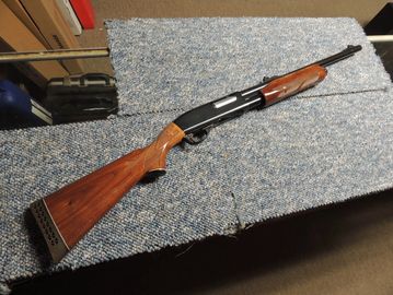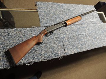 Remington 870 Wingmaster. 12GA. Pump action. 2 3/4" chamber. 20" smoothbore slug barrel. Used but in nice shape. Looks like it wasn't fired very much but it does have a crack in the butt stock at the wrist. Doesn't wiggle though. Nice looking gun. 20250419